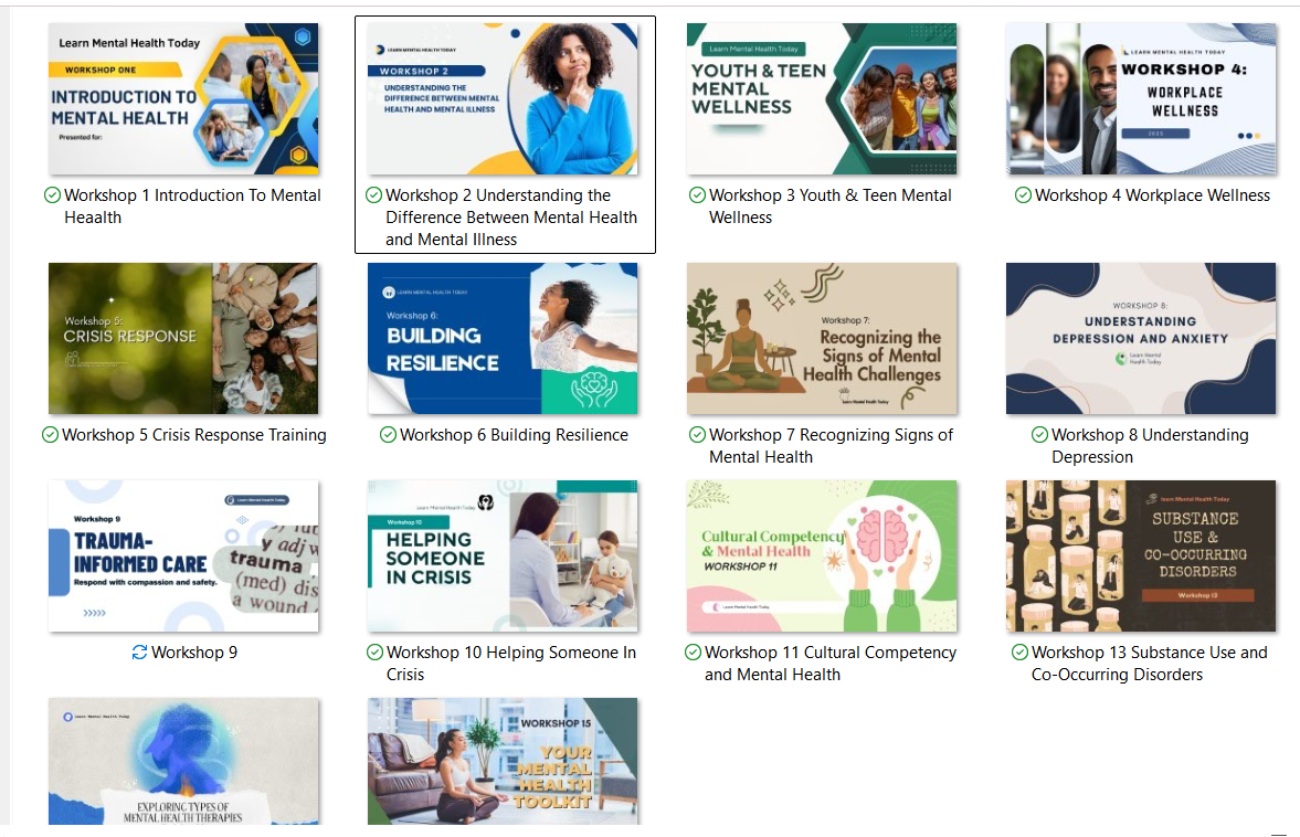 Face-to-face connection is one of the most powerful ways to create impact. Whether you’re training staff, engaging community members, or hosting public events, Learn Mental Health Today equips you with the tools to deliver your message effectively. With 15 professionally designed PowerPoint presentations, your team can confidently lead workshops, trainings, and awareness sessions. Each presentation is paired with a facilitator’s guide, ensuring smooth delivery and consistent results across every audience. But that’s not all.